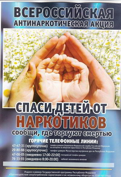 С 16 по 21 ноября 2015 года на территории Республики Мордовия проводился второй этап Всероссийской акции "Сообщи, где торгуют смертью", направленный на повышение сознательности граждан в вопросах противодействия распространению наркомании.